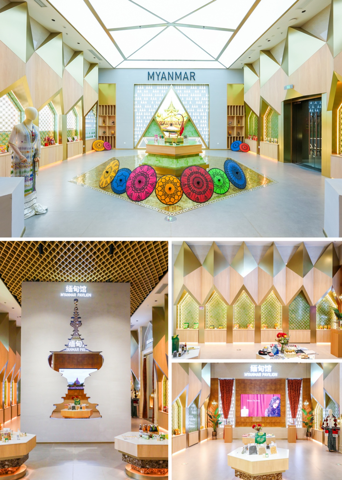 匯聚中心精心打造了18個(gè)獨(dú)具特色的主題館。其中,緬甸主題館以緬甸深厚的歷史文化為根基,提取經(jīng)典佛塔輪廓、翡翠色澤、寶石切面與漆器造型等代表性元素,巧妙融入當(dāng)?shù)鬲?dú)特風(fēng)土人情,并借助現(xiàn)代設(shè)計(jì)語言進(jìn)行演繹,為到訪者呈現(xiàn)出一個(gè)流光溢彩、熠熠生輝的“金色緬甸”。